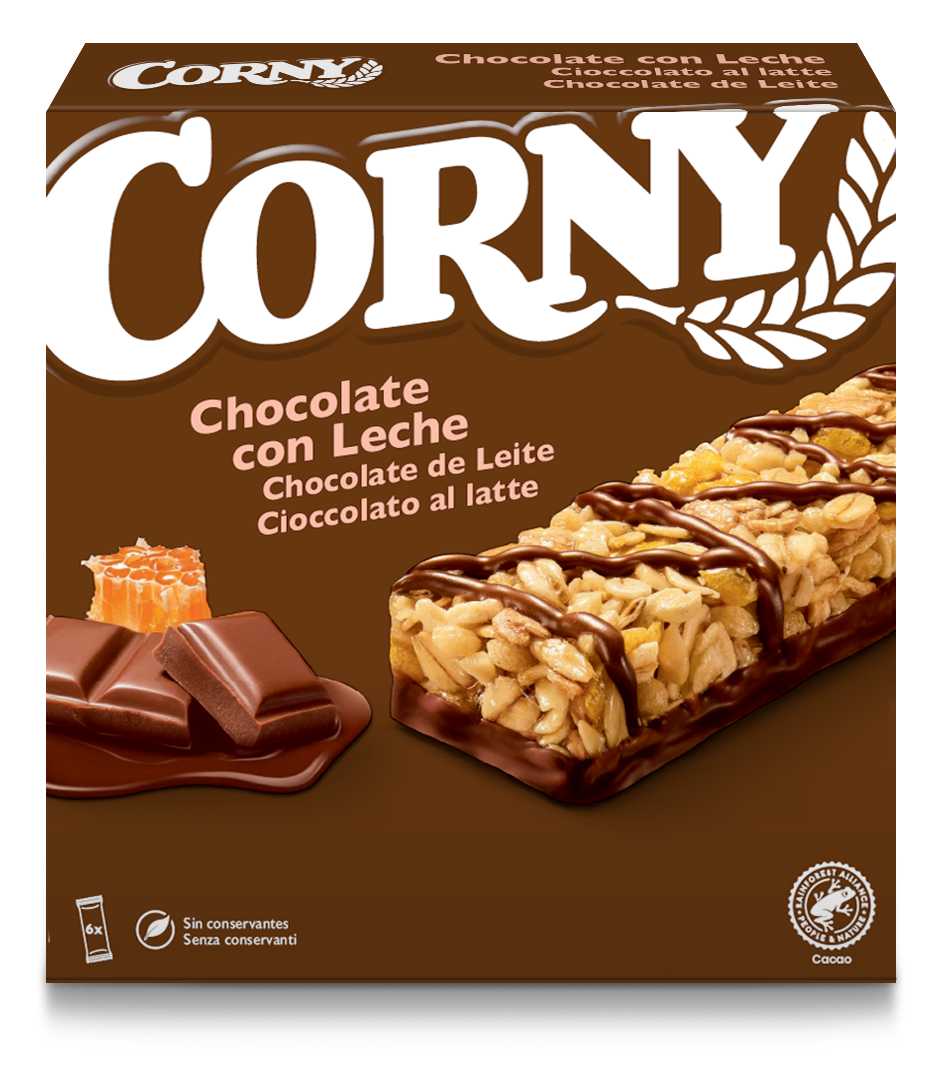 I grandi classici non tramontano mai. CORNY sceglie il meglio per le barrette ai cereali: fiocchi di cereali integrali tostati, delizioso miele d'api, cacao certificato Rainforest Alliance* e altri ingredienti selezionati.